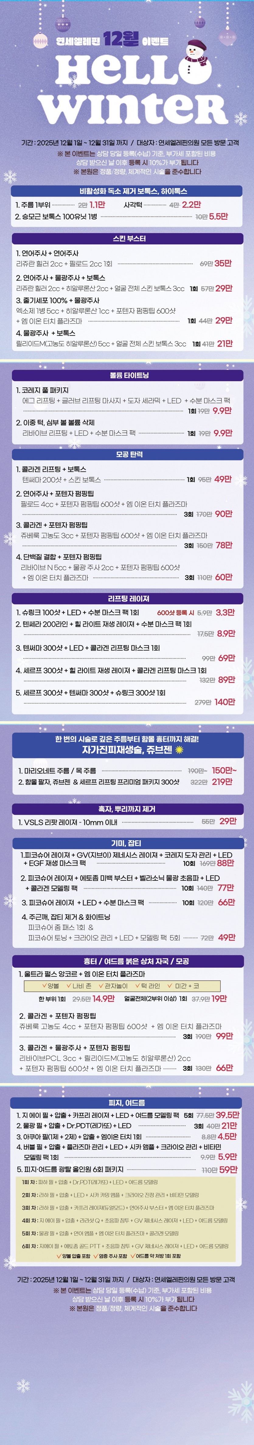 25년도 12월 겨울시즌이벤트 페이지 정보 작성자 최고관리자 댓글 0건 조회 874회 작성일 25-11-28 10:32 목록 본문 25년도 12월 겨울시즌이벤트 이전글25년도 겨울시즌 1회체험 이벤트 25.11.28 다음글연세엘레핀 1회 체험 이벤트 25.10.31 댓글 0 댓글목록 등록된 댓글이 없습니다.