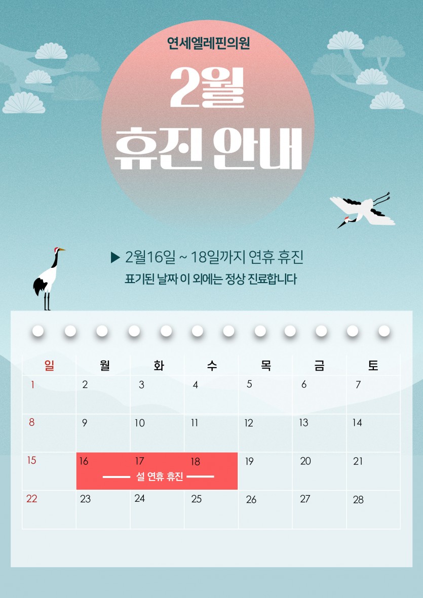 2026년 2월 휴진안내 페이지 정보 작성자 최고관리자 댓글 0건 조회 178회 작성일 26-01-30 13:27 목록 본문 2026년 2월 휴진안내 이미지 확인 부탁드립니다 이전글26년도 3월 휴진일 공지드립니다 26.02.26 다음글2026년 1월 휴진안내 (새해복 많이 받으세요) 25.12.26 댓글 0 댓글목록 등록된 댓글이 없습니다.