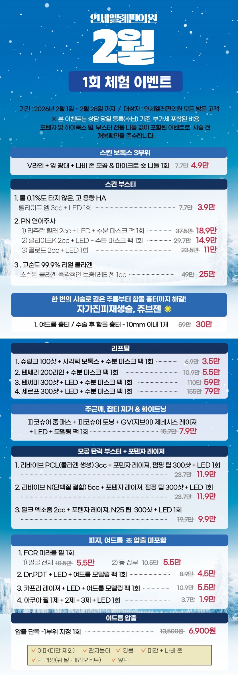 26년도 2월 1회 체험 특별가 이벤트 페이지 정보 작성자 최고관리자 댓글 0건 조회 32회 작성일 26-01-30 13:36 목록 본문 26년도 2월 1회 체험 특별가 이벤트 다음글26년도 2월 이벤트 안내 26.01.30 댓글 0 댓글목록 등록된 댓글이 없습니다.