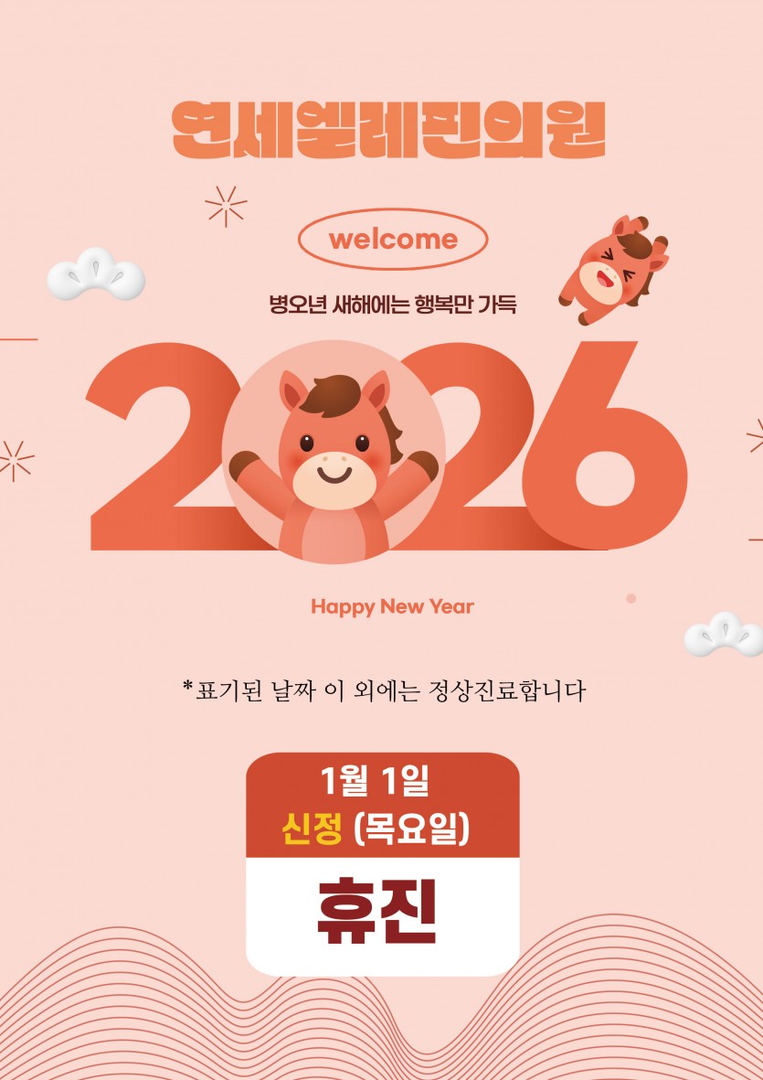 2026년 1월 휴진안내 (새해복 많이 받으세요) 페이지 정보 작성자 최고관리자 댓글 0건 조회 142회 작성일 25-12-26 11:49 목록 본문 2026년 1월 휴진안내 (새해복 많이 받으세요) 이전글2026년 2월 휴진안내 26.01.30 다음글25년도 12월 진료일정안내 25.11.28 댓글 0 댓글목록 등록된 댓글이 없습니다.